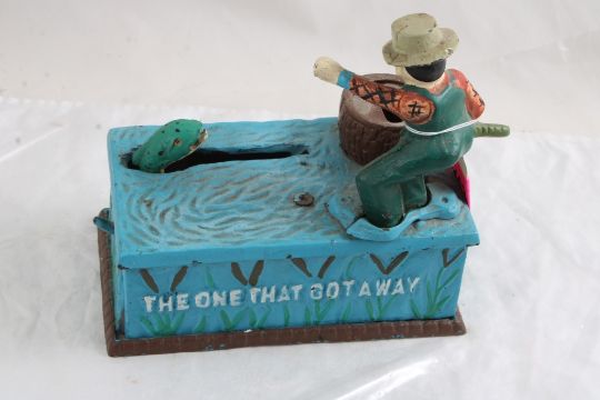 Cast Iron Mechanical Bank The One That Got Away - As pictured. Please ask questions & read terms and conditions before bidding.