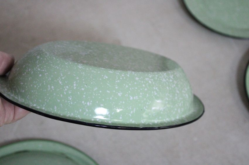 Enamelware Green Speckle Lot - Double Boiler, Kettle, Sauce Pan, Serving Dish, 2 Plates and Assortment of Lids. All as pictured. Please ask questions & read terms and conditions before bidding.