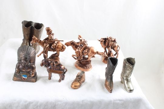 9 Western Theme Figurines - Mt Rushmore Indian 3.5" Tall, 3 Hallmark Western Metal looking Figurines of Miner Cowboys that measure 2.5", 3.5" & 4" Tall, Pack Mule 2.5" Tall, Pair of Cowboy Boots 3" Tall, 2 single cowboy boots that measure2.75" Tall and one Baby Shoe that measures 1.75" long. All as pictured. Please ask questions & read terms and conditions before bidding.