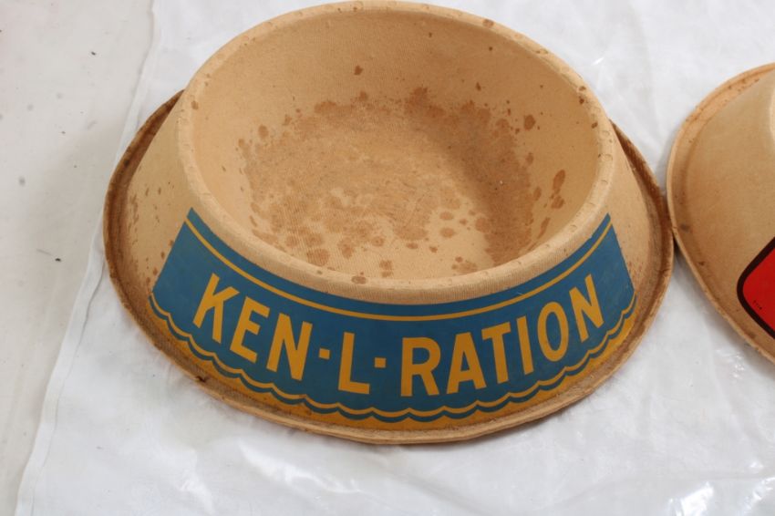 2 Mid-Century Advertising SAVADAY Dog Bowls - Advertising for Friskies Dog Food and Ken-L-Ration Dog Food as pictured. Please ask questions & read terms and conditions before bidding.