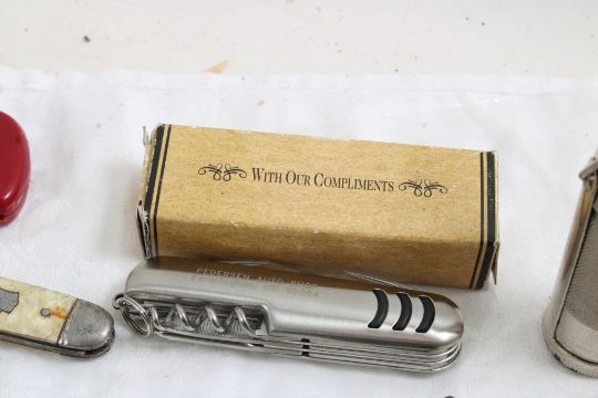 Pocket Knives, Telegraph, Patch Tin, Corn Husker - Marshall Flour Mill Advertising Pin Tray, Pocket knives include: Buck 380 Advertising Cedar Co-op Elevator of Little Cedar Iowa, Advertising Standard Oil, Buck 380 Fairmont Camillus, K-Bar & others. Rain GaugeAdvertising Farmers Elevator Eyota, Stewartville & Elgin new in Box, Balloon Motometer Gauge, A Match Safe made in Hong Kong. All as pictured. Please ask questions & read terms and conditions before bidding.