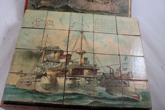 Antique McLaughlin Bros Battleship Block Puzzle - ca. 1898 McLaughlin Bros. Block Cube Puzzle depicting 6 different USA Battleships along with Prints of each ship as well. Puzzles when put together measure 12.5" x 10". Nice condition considering over 100 years old.As pictured. Please ask questions & read terms and conditions before bidding.