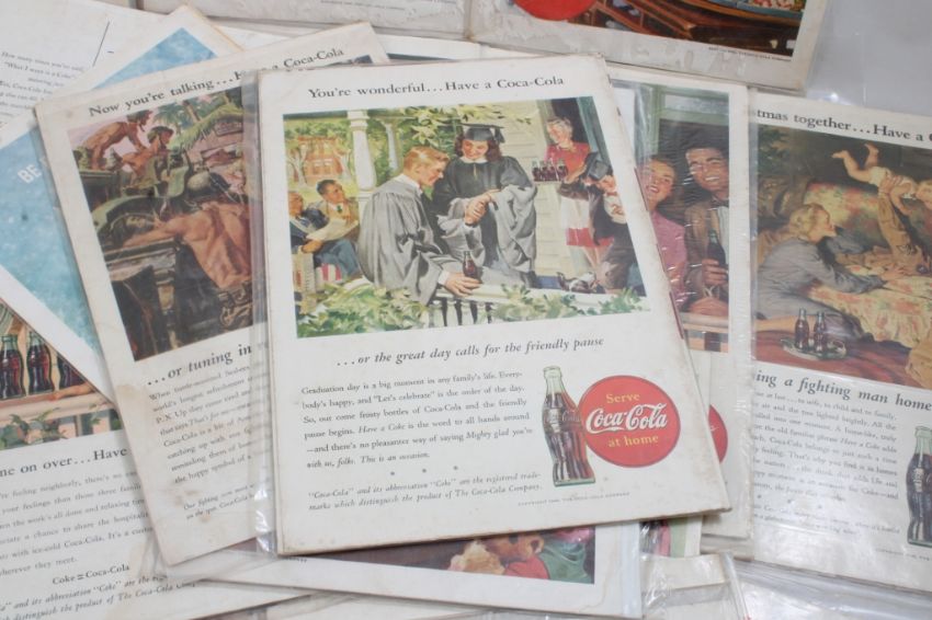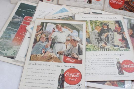 23 1940's & 50's Coca Cola Print Ads 7" x 10" Each - As pictured. Please read terms and conditions and askquestions before bidding. Live Auctioneers only shows 20 photos per lot. All photos can be viewed on Proxibid and our bidding app.