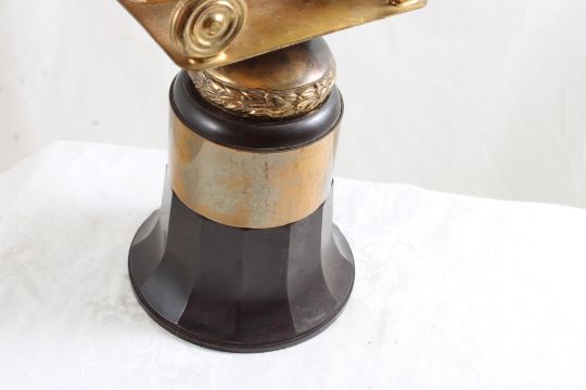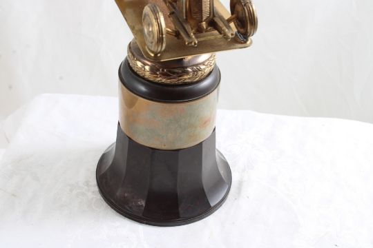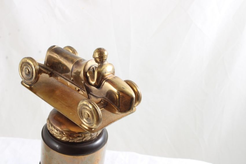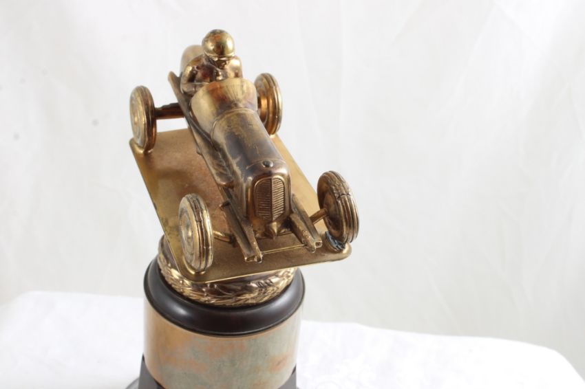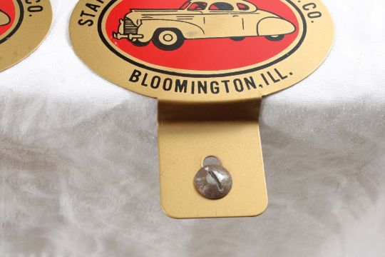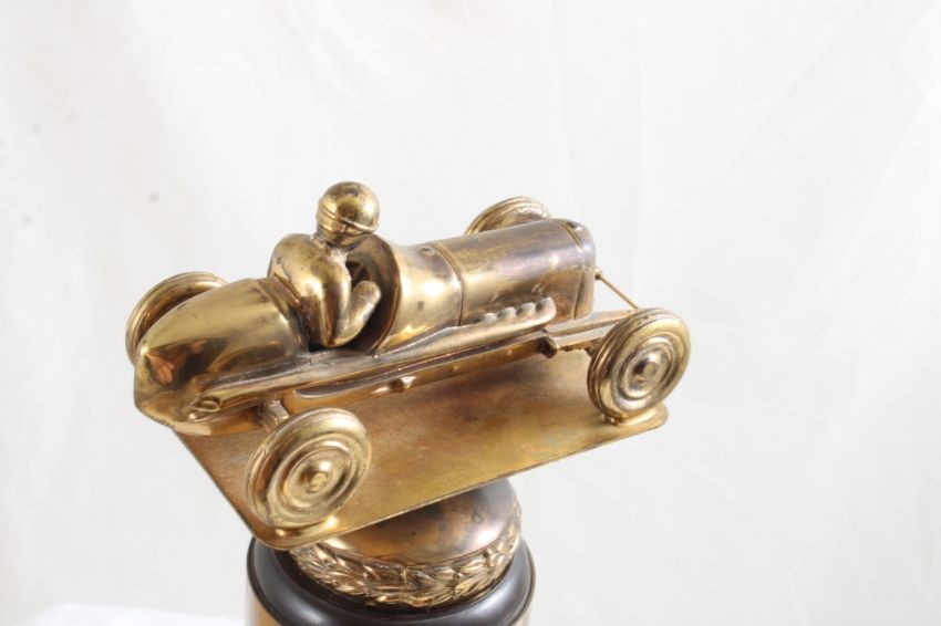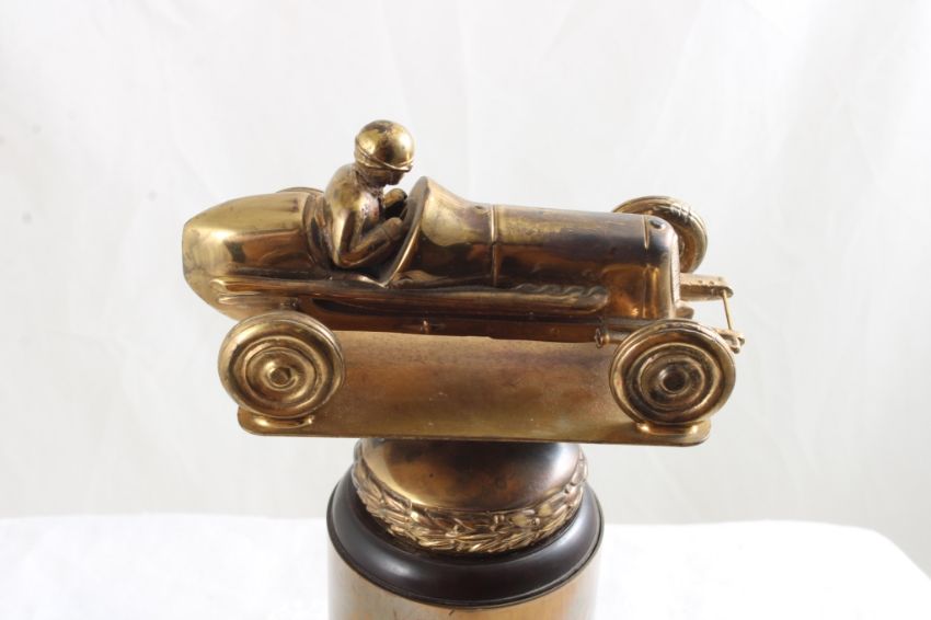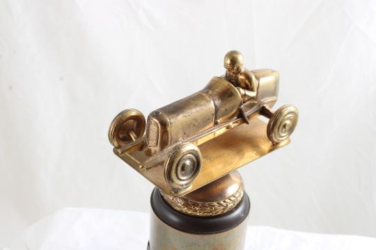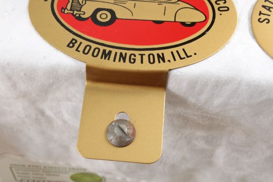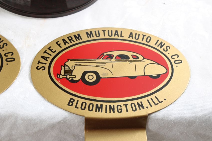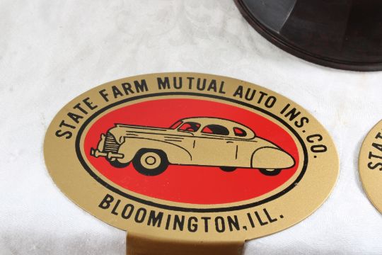 2 License Plate Toppers, Race Car Trophy 8.5" Tall - Solid Brass & Bakelite Never Awarded Race Car Trophy & 2 1940's State Farm Insurance License Plate Toppers. As pictured. Please read terms and conditions and askquestions before bidding. Live Auctioneers only shows 20 photos per lot. All photos can be viewed on Proxibid and our bidding app.