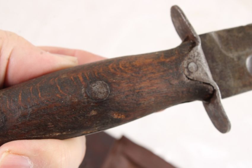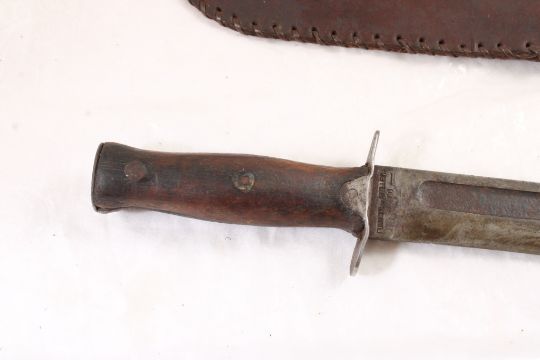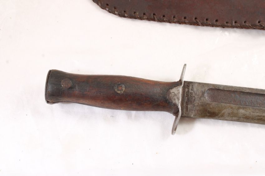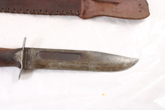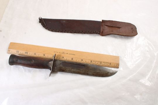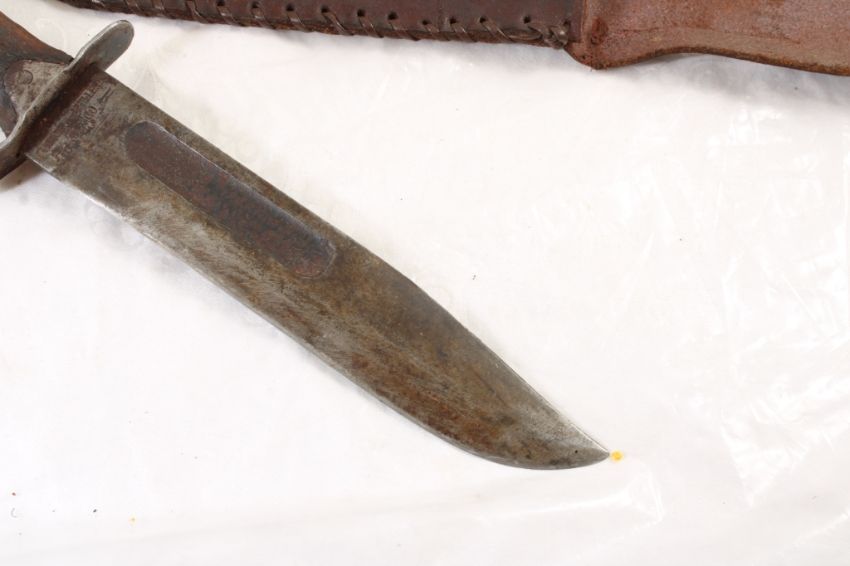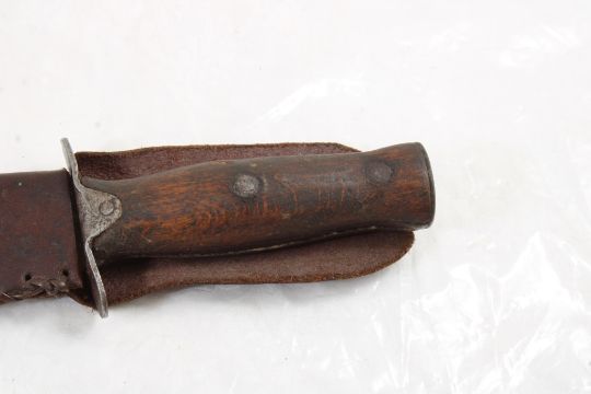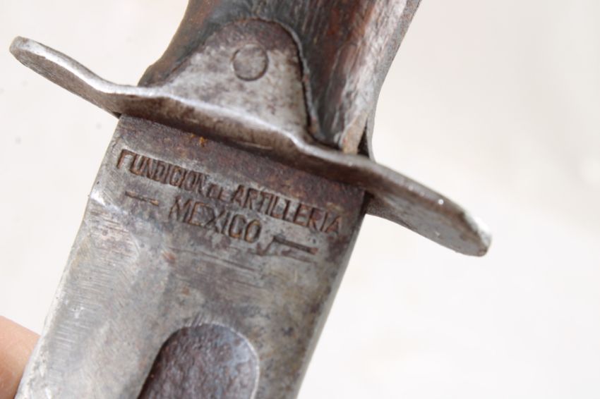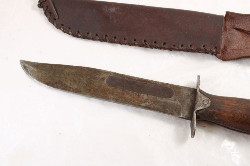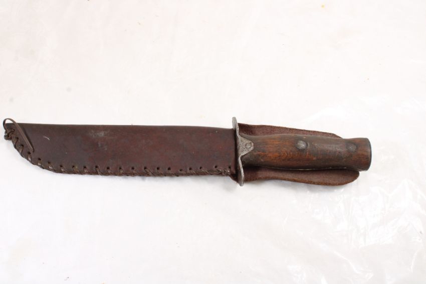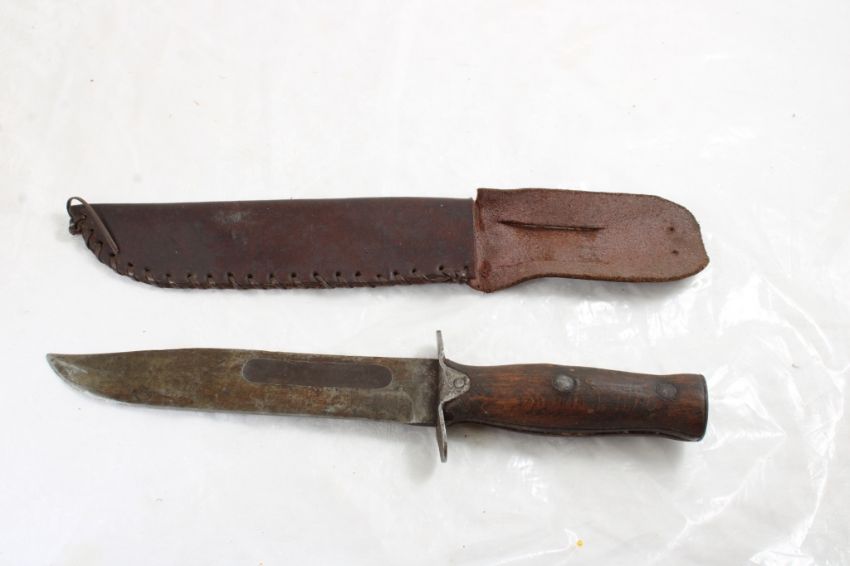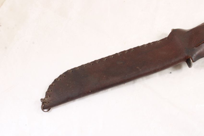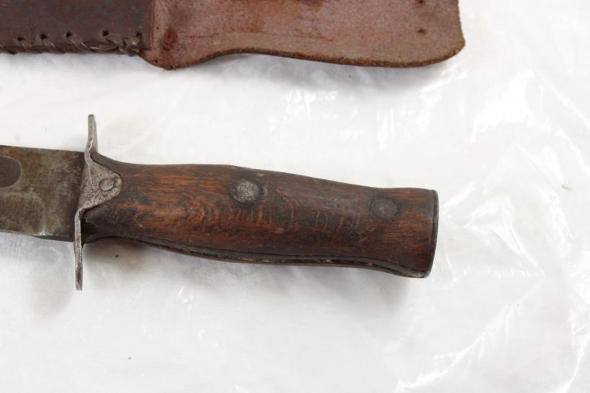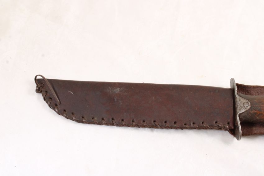 Mexican WW2 Fighting Fixed Blade Knife - with leather sheath. As pictured. Please read terms and conditions and askquestions before bidding. Live Auctioneers only shows 20 photos per lot. All photos can be viewed on Proxibid and our bidding app.