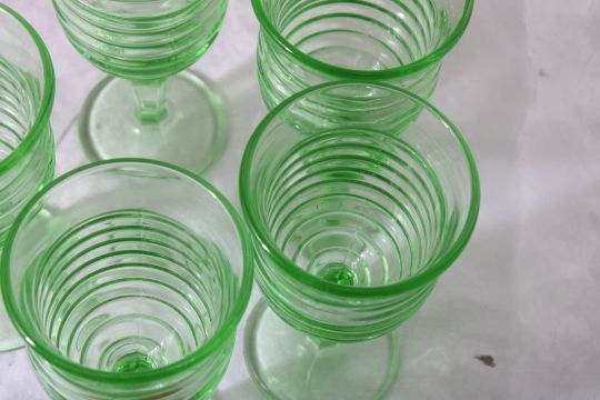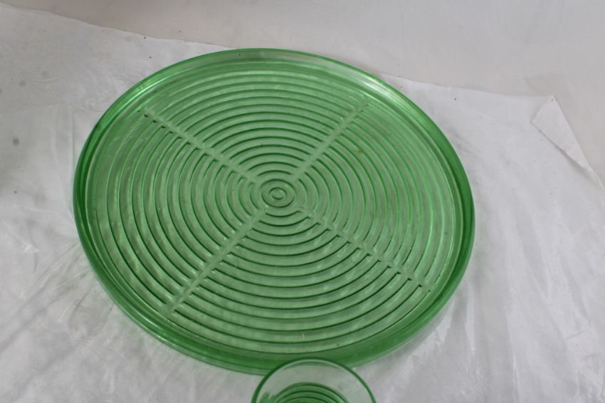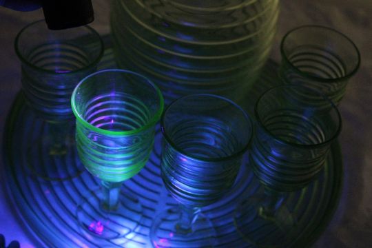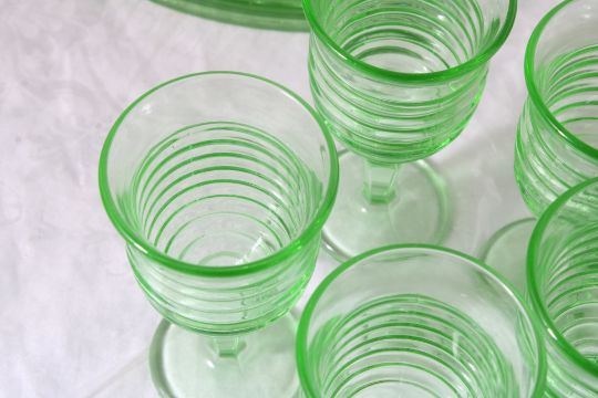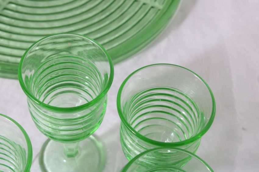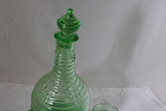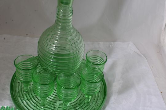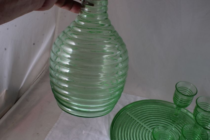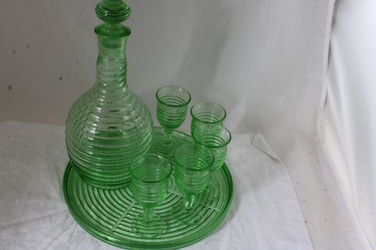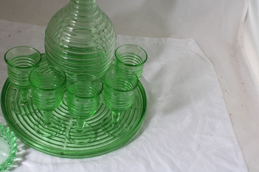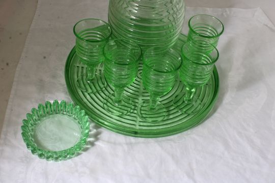 Uranium Glass Decanter Set - Includes Pitcher, 5 Glasses, Ashtray & Underplate. All as pictured. Please read terms and conditions and askquestions before bidding. Live Auctioneers only shows 20 photos per lot. All photos can be viewed on Proxibid and our bidding app.