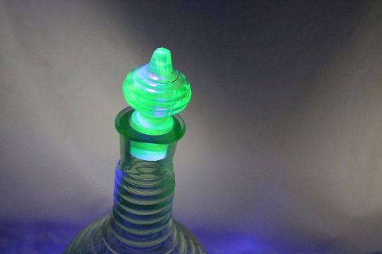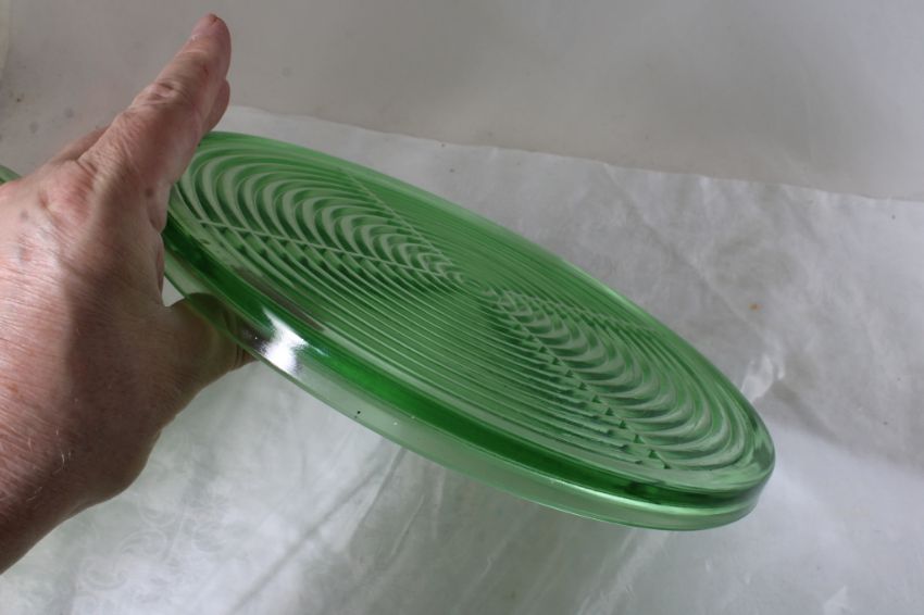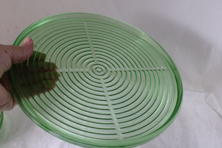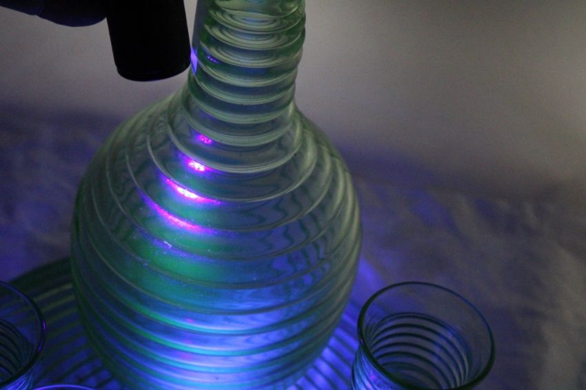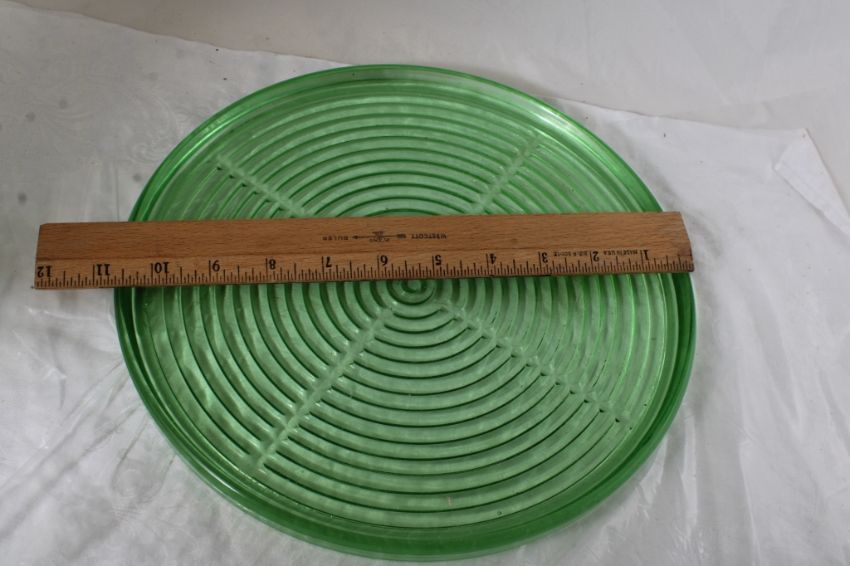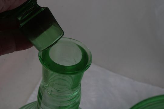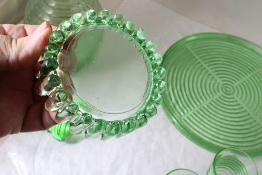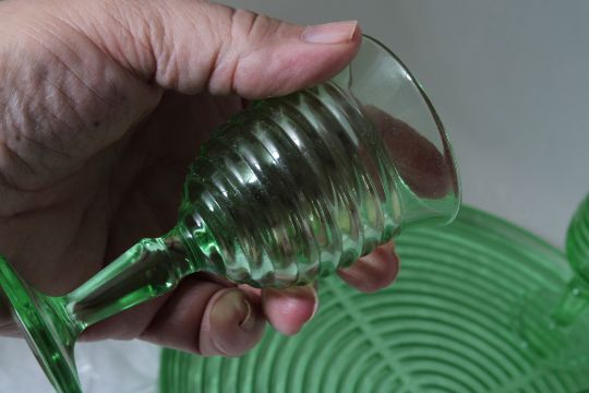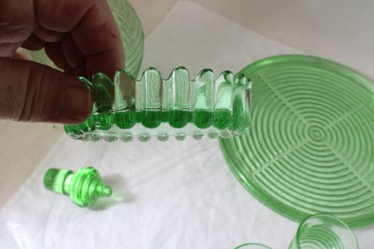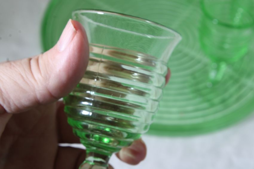 Uranium Glass Decanter Set - Includes Pitcher, 5 Glasses, Ashtray & Underplate. All as pictured. Please read terms and conditions and askquestions before bidding. Live Auctioneers only shows 20 photos per lot. All photos can be viewed on Proxibid and our bidding app.