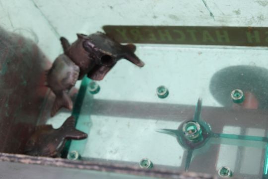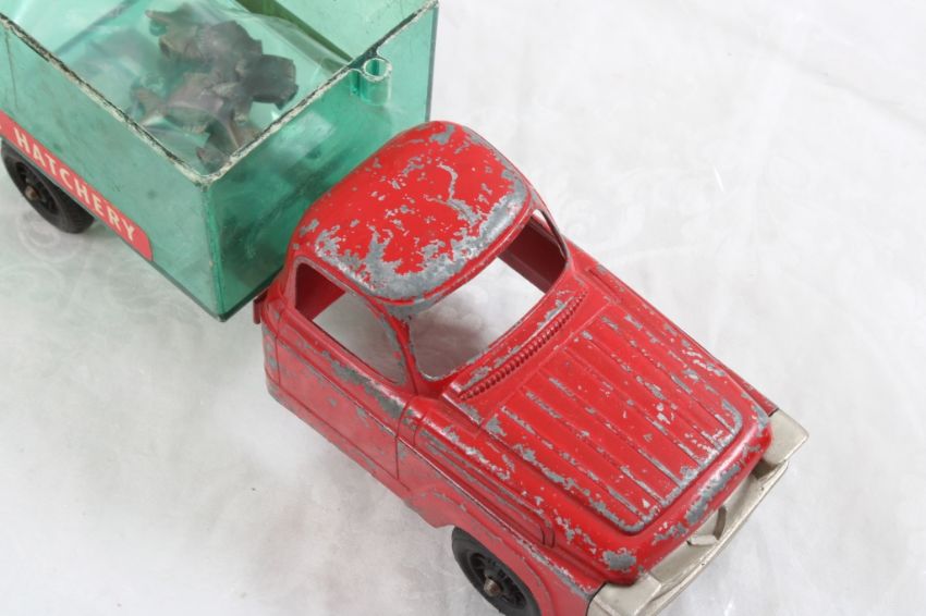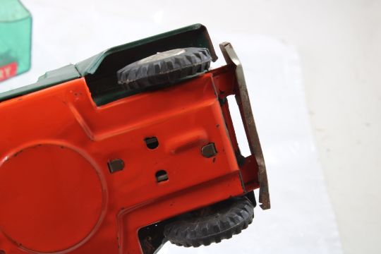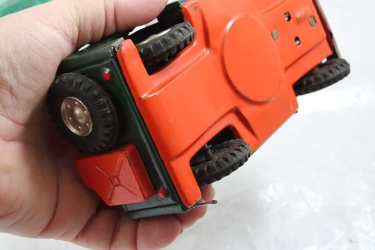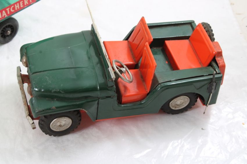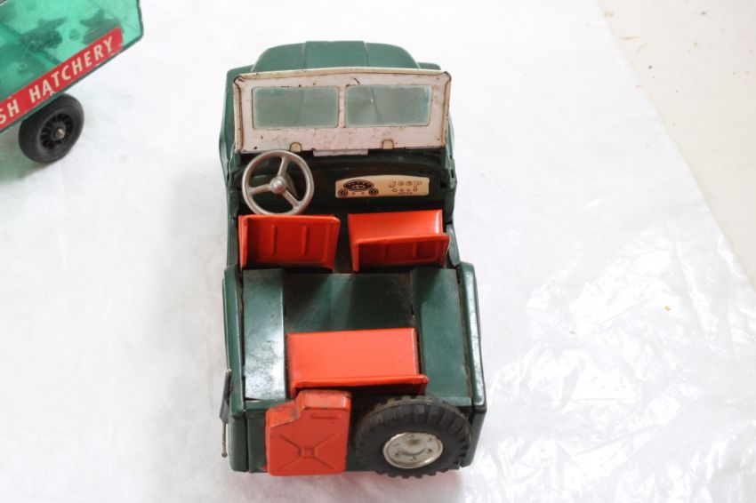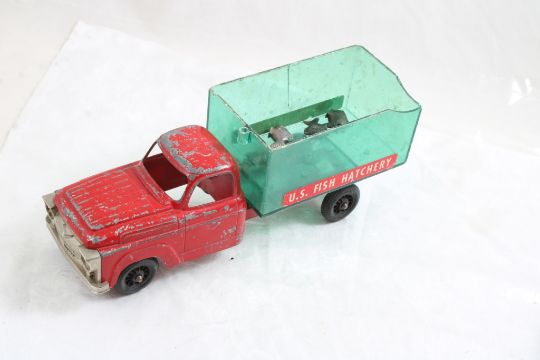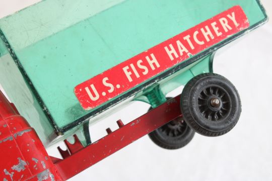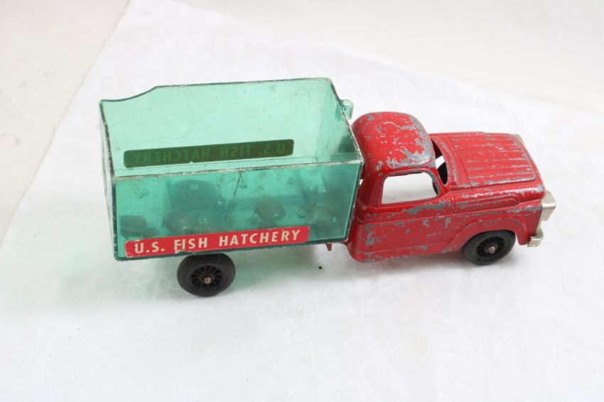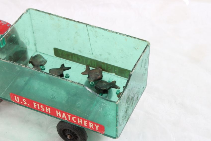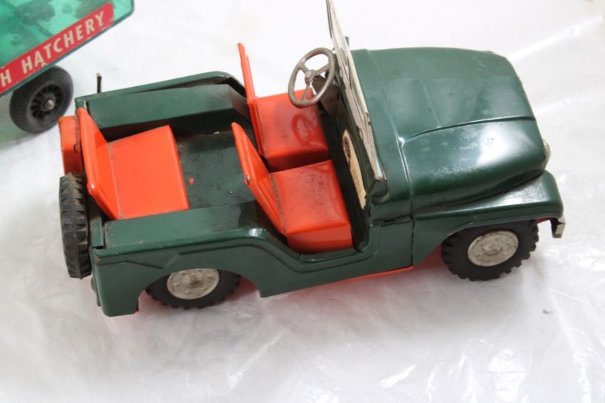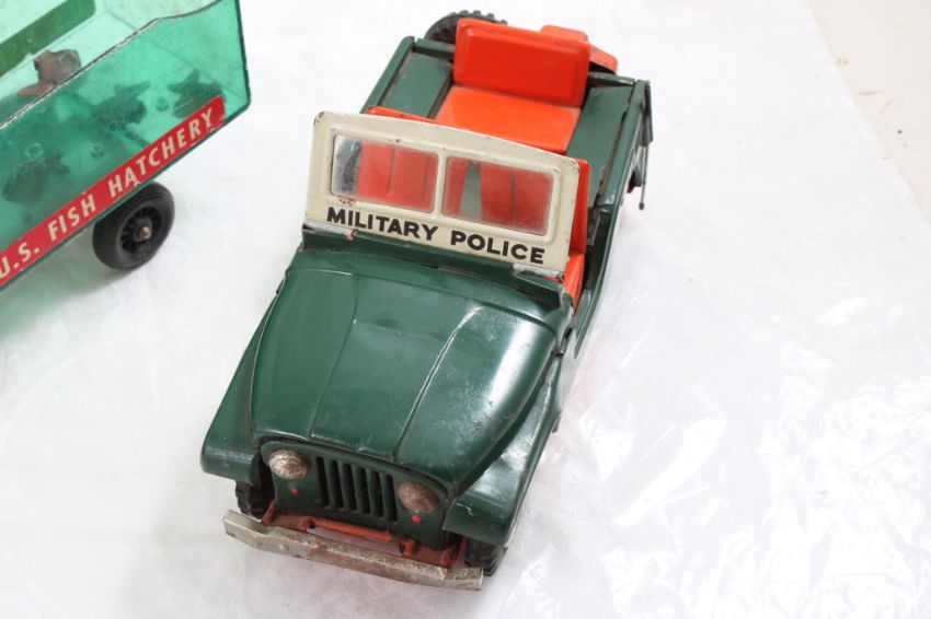 Hubley Fish Truck, Military Police Friction Jeep - Hubley Metal U S Fish #470 Hatchery Truck 9 3/4" with Fish and Tin friction Military Police Jeep made in Japan 7.5" Long. As pictured. Please read terms and conditions and askquestions before bidding. Live Auctioneers only shows 20 photos per lot. All photos can be viewed on Proxibid and our bidding app.