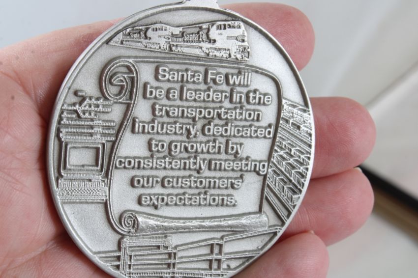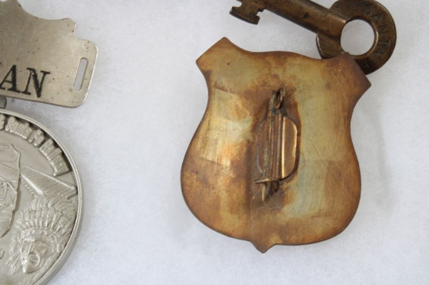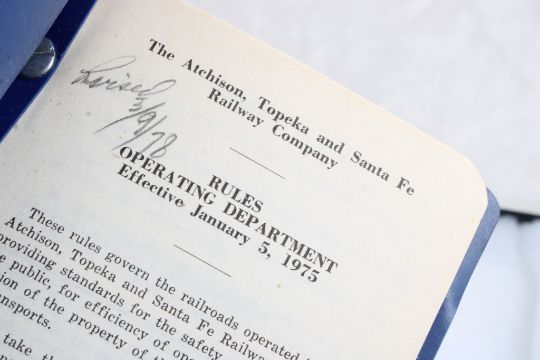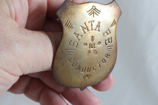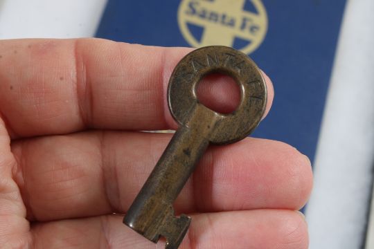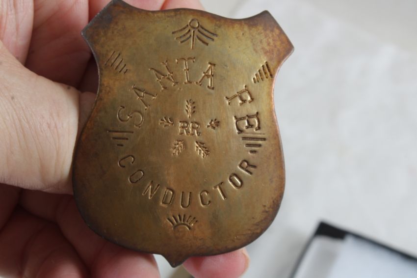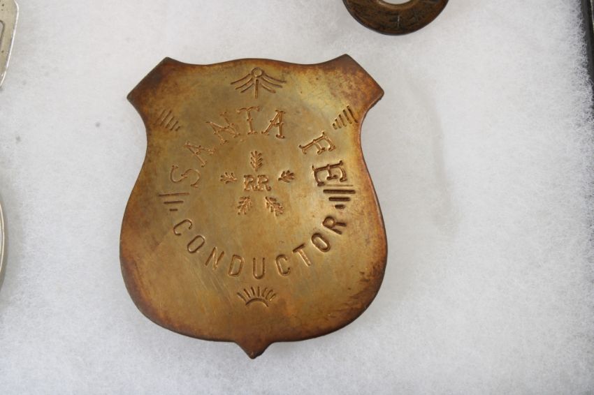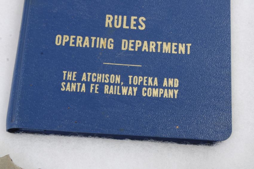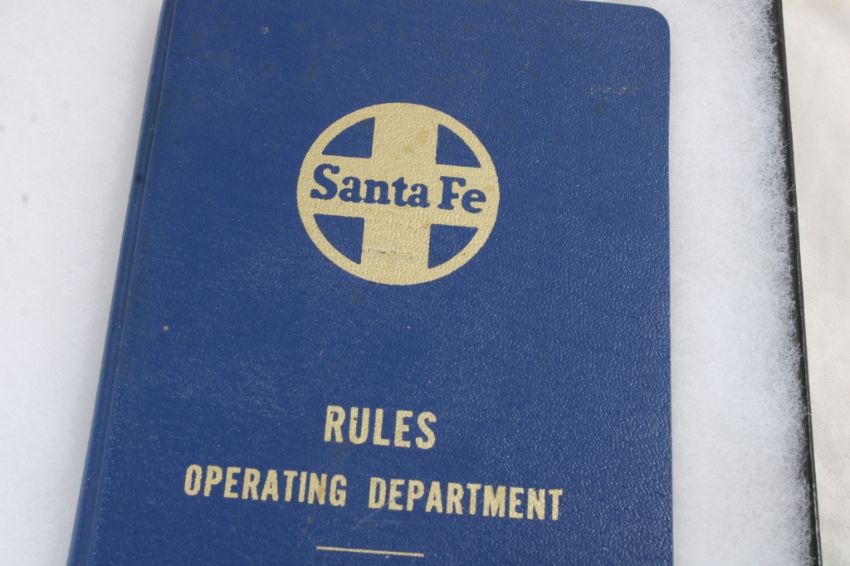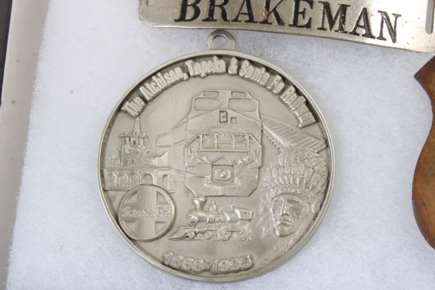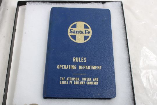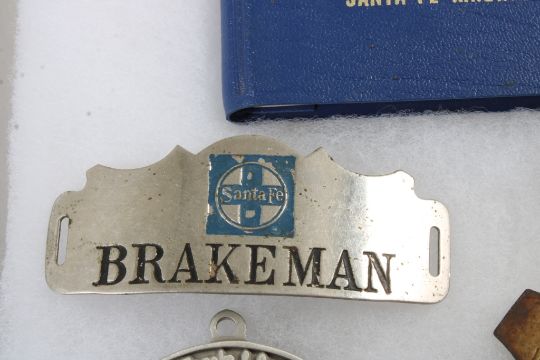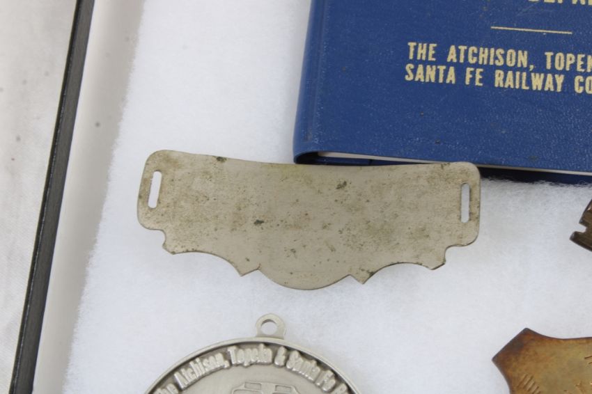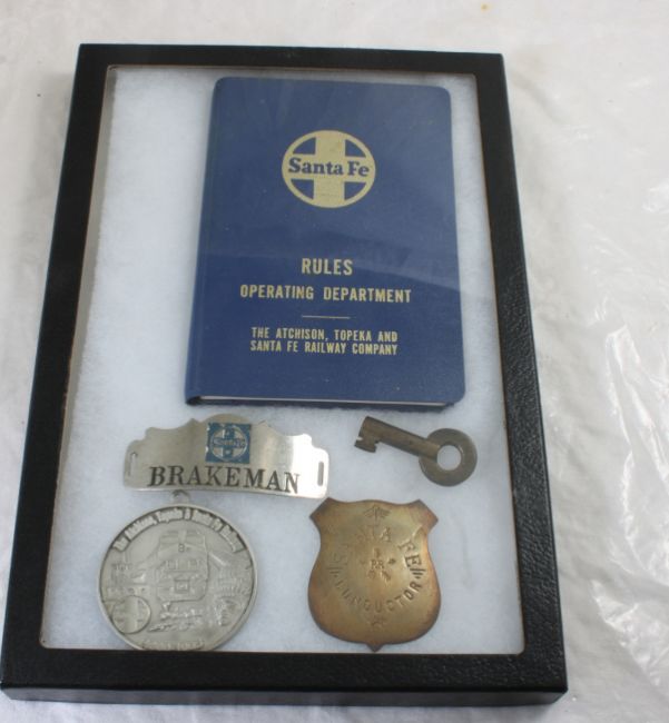 Railroad Memorabilia in Riker Case - Brakeman Hat Badge, Conductor Badge, Atchison Topeka & Santa Fe Railway Medallion 1868-1995, 1975 Santa Fe Rules Manual & Santa Fe Switch Key. All as pictured. Please read terms and conditions and askquestions before bidding. Live Auctioneers only shows 20 photos per lot. All photos can be viewed on Proxibid and our bidding app.