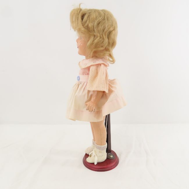 2 Vintage Ideal Shirley Temple 13" Compo Dolls - both have head and back marked "Shirley Temple 13", both have some cracking in compo, sleep eyes with lashes (some missing) and open mouth with teeth. Doll in pink floral dress is strung very tight and the other isslightly loose. The one in dark pink floral dress has wig that has been glued and some damage to eyes. White & pink dress doll is missing a shoe, both with stands. Photos are part of the description. Live Auctioneers only shows 20 photos per lot, Proxibid and Bid.ANewDayAuctions.com show all if there are more than 20. Ask questions and read terms & conditions prior to bidding,