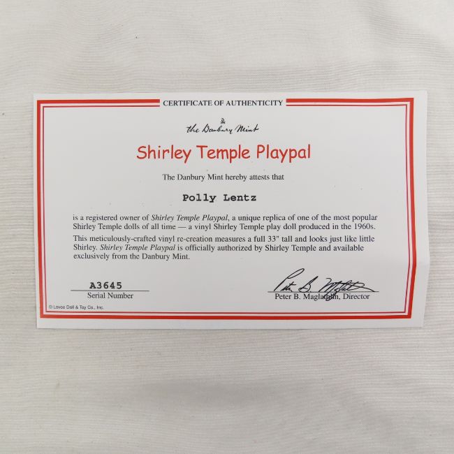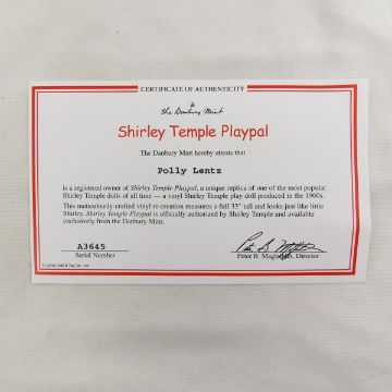 Danbury Mint Shirley Temple Playpal Doll in Box - 33" tall vinyl, jointed at neck, shoulder, wrists & hips. Original outfit with signature pin, sleepy eyes with lashes, open mouth with teeth, dimples. Has stand, with COA and papers, box has some water damage (doll wasdisplayed so did not get damaged. Photos are part of the description. Live Auctioneers only shows 20 photos per lot, Proxibid and Bid.ANewDayAuctions.com show all if there are more than 20. Ask questions and read terms & conditions prior to bidding,