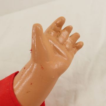 1936 Ideal Shirley Temple Texas Ranger 27" Doll - All compo, socket head, straight legs, arms slightly bent at the elbow, flirty eyes missing upper hair lashes, painted lower lashes & brows, open mouth with six teeth, blonde mohair wig with red ribbon. Minimalcrazing. No mark on back of head, back is marked "SHIRLEY TEMPLE 27". Outfit made to commemorate Shirley Temple's appearance at the 1936 Texas Centennial Celebration. Shirt has tag that it was made by CatherineKauffman, no other pieces are marked- styled to replicate original outfit. Photos are part of the description. Live Auctioneers only shows 20 photos per lot, Proxibid and Bid.ANewDayAuctions.com show all if there are more than 20. Ask questions and read terms & conditions prior to bidding,