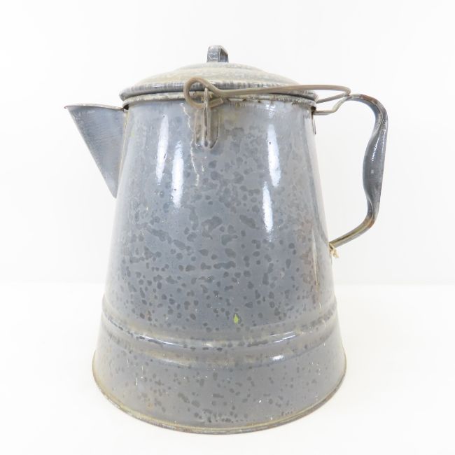 Vintage Enamelware Coffee Pot, Wood Barrel - really small bird cage & more Photos are part of description. Please ask questions and read terms & conditions before bidding.