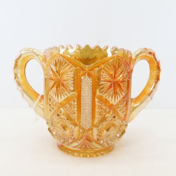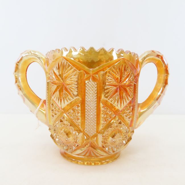Antique Carnival Glass, Red Wing Ashtray & More - Unused Vera Bradley quilted purse, peach color rose pattern bowl, Imperial princess lace compote, marigold Imperial cracked ice candlesticks, blue peacock eye compote, marigold pansy pattern sugar bowl, marigoldcut star pattern sugar bowl, Noritake sugar & cream set, sand art in bottle Photos are part of description. Please ask questions and read terms & conditions before bidding.