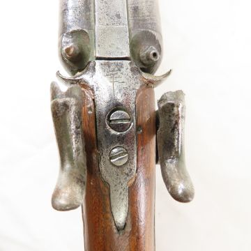 Antique Double Barrel Percussion Cap Rifle - antique, 40" barrels with front bead sight, muzzle end measure 18.45mm, double trigger, woods tock has had some repairs, metal butt plate, with rod, some remaining scrollwork on trigger guard, completely unmarked. No FFLtransfer required for most buyers. Bidders please know local laws before bidding. Photos are part of description. Please ask questions and read terms & conditions before bidding.