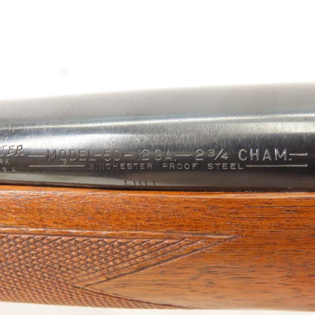 Winchester Model 50 Semi-Auto 12 GA Shotgun - SN# 130128, 23.5" proof steel barrel, 2 3/4" chamber, adjustable front & rear sights, checkered wood forearm and pistol grip stock with plastic butt plate. mfg 1954 to 1962. C&R or FFL transfer required, Bidders pleaseknow local laws before bidding. Photos are part of description. Please ask questions and read terms & conditions before bidding.