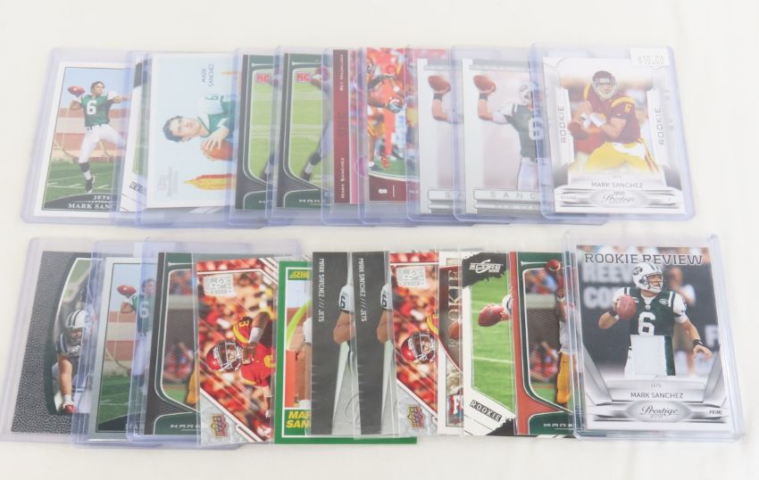 22 Mark Sanchez Football Cards - many Rookies, Draft, Jersey Card Photos are part of description- Live Auctioneers only shows 20 photos per lot, if there are more you can view them on Proxibid or bidding app. Please ask questions and read terms & conditions before bidding.