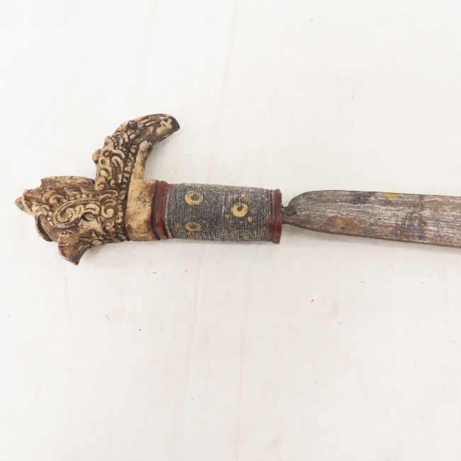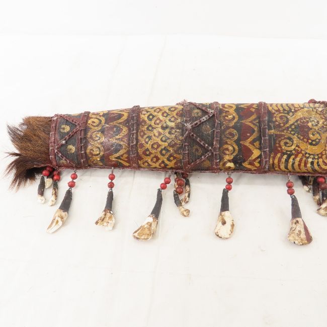 Mandau Sword & Knife of Dayak Headhunters - Dayak tribe of Borneo, Indonesia. Hand painted sheath is wood and rattan with hair and teeth, carved handle has a few chips, Blade is 18.5" has 4 circular holes and visible hand work. OAL 25", smaller knife has 4.5" blade 7" OAL Photos are part of description- Live Auctioneers only shows 20 photos per lot, if there are more you can view them on Proxibid or bidding app. Please ask questions and read terms & conditions before bidding.