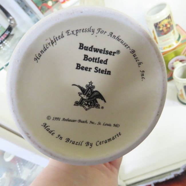 7 Assorted Budweiser Steins and Metal Sign - sign 36", glass American Sportsman bottle is 15", Steins: 1999 Stein & Tin III Historic Advertising, 1998 Stein & Tin 1 (no tin), 1989 Discovery of America NINA, California, 19991 Bottled Beers, 1993 Air FOrce, GlassStein Photos are part of description- Live Auctioneers only shows 20 photos per lot, if there are more you can view them on Proxibid or bidding app. Please ask questions and read terms & conditions before bidding.