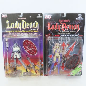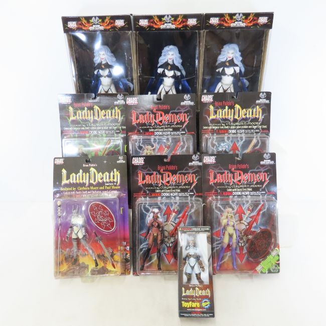 Lady Death Action Figures On Cards - and in boxes Photos are part of description- Live Auctioneers only shows 20 photos per lot, if there are more you can view them on Proxibid or bidding app. Please ask questions and read terms & conditions before bidding.