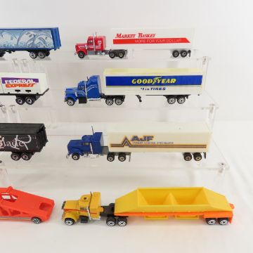 Matchbox, Road Champs & Other Diecast Semi Trucks - with trailers- most are 1:64 scale Photos are part of description- Live Auctioneers only shows 20 photos per lot, if there are more you can view them on Proxibid or bidding app. Please ask questions and read terms & conditions before bidding.
