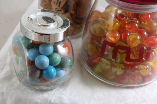 Jars of Marbles, Wood Letter Tiles, Wood Golf Tees - 2 jars of vintage marbles, 1 jar of antique wood alphabet tiles, 1 jar of Frank R Bertsch of Iowa Wooden Golf Tees in multiple colors.. Photos are part of description- Live Auctioneers only shows 20 photos per lot, if there are more you can view them on Proxibid or bidding app. Please ask questions and read terms & conditions before bidding.