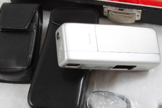 Minolta 16 MG Sub Miniature Spy Film Camera w/Case - 10" x 6.5" x 2". Photos are part of description- Live Auctioneers only shows 20 photos per lot, if there are more you can view them on Proxibid or bidding app. Please ask questions and read terms & conditions before bidding.