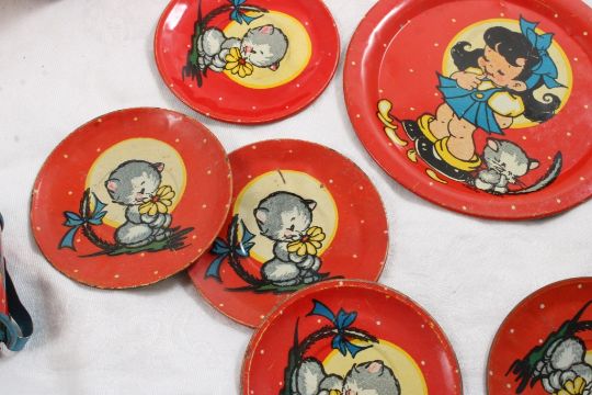 Ohio Art Tin Litho Child's Tea Party Set - Platter measures 7.5" x 5".. Photos are part of description- Live Auctioneers only shows 20 photos per lot, if there are more you can view them on Proxibid or bidding app. Please ask questions and read terms & conditions before bidding.
