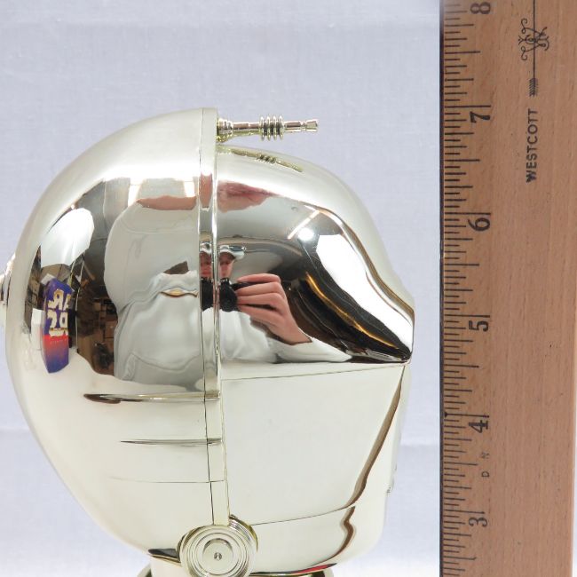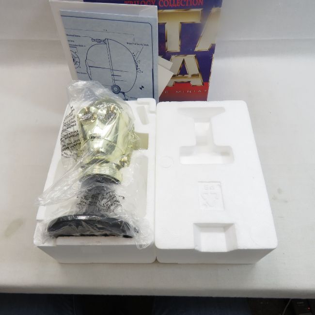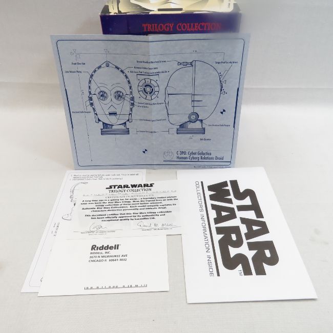 Riddell C-3PO Star Wars Authentic Miniature Helmet - Complete with box, COA. Small tear on box as shown. Please ask questions and read terms & conditions before bidding. Photos are part of description- Live Auctioneers only shows 20 photos per lot, if there are more you can view them on Proxibid or our bidding app.