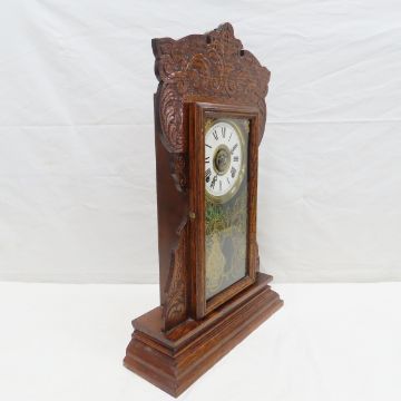 2 Antique Gingerbread Mantel Clocks, Gilbert - Tested: Gilbert Capitol #43, pendulum working, chimes, keeps time. Possible Ingraham, pendulum works, chimes, uncertain if keeping time. 22" tall, both come with pendulum & key. Lot size: 22 x 14 x 9", 14lbs Photos are part of lot description. Please ask questions and read terms & conditions before bidding.