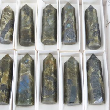 Collection of 36 Labradorite Crystal Points - Largest 3", Lot size: 16 x 11 x 2", 6 lbs Photos are part of lot description. Please ask questions and read terms & conditions before bidding.