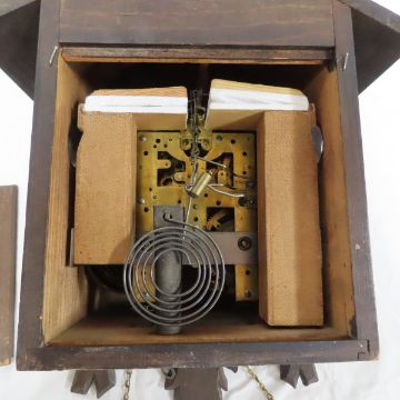 Vintage American Cuckoo Clock w/ German Mechanics - Tested: Chimes, hands appear to be advancing, one hoop detached from pinecone as seen in photo. Mechanics have the appearance of having been restored. Black Forest style clock Made by American Cuckoo Clock Co. NewYork, using German parts. pendulum, key & 2 pinecones included. 16" tall, Lot size: 13 x 11 x 7", 5 lbs Photos are part of lot description. Please ask questions and read terms & conditions before bidding.