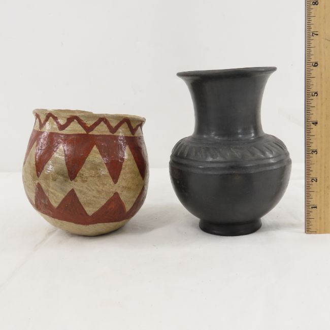 6 Contemporary Mexican Handmade Clay Vessels - Tallest is 9", One vessel has chipped opening, Lot size: 18 x 16 x 14", 8 lbs Photos are part of lot description. Please ask questions and read terms & conditions before bidding.