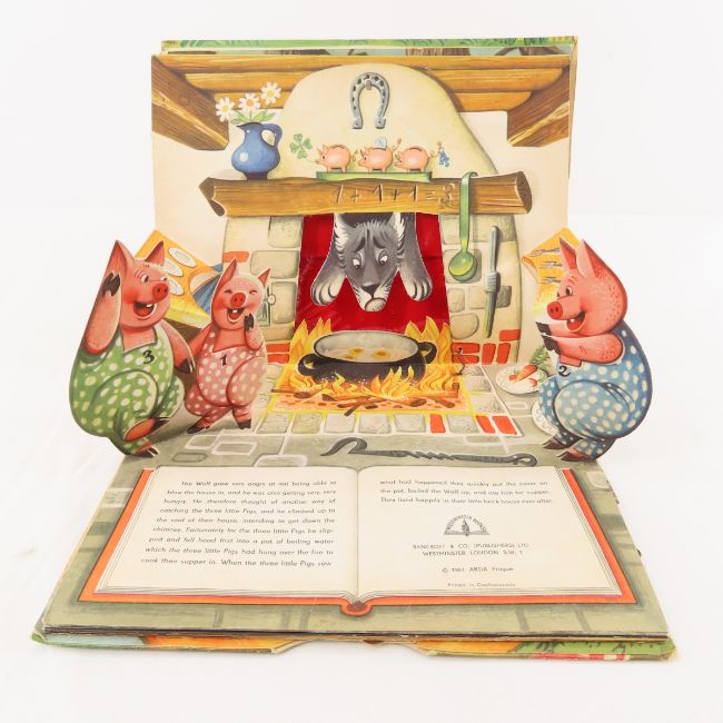 3 Little Pigs / Goldilocks 2 sided Pop Up Book - 1961 Artia Prague, Czechoslovakia, 1st pop up on 3 little pigs side has come unglued, pig is missing from brick pig house. Lot size: 10.5 x 8 x .5" , 13 ozPhotos are part of description. Please ask questions and read terms & conditions before bidding.