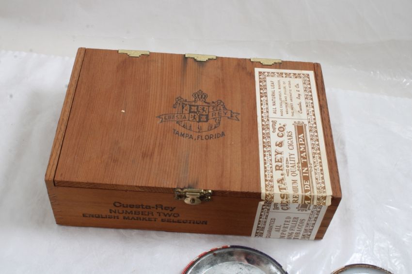 Cuesta Ray Wood Cigar Box, Vintage Political Pins - Political pinbacks are for Nixon, Humphrey, Wallace, Eisenhower, Johnson, Templar, and Armor Franks "You're DIMPH" Pin. Cigar Box measures 8" x 5.5". All as pictured.Photos are part of description. Please ask questions and read terms & conditions before bidding.