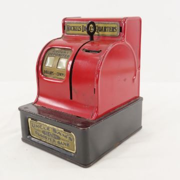4 Vintage Coin Banks & Uncle Sam Cash Register - TV, US Mail & Northwestern Bank. Register is 6" tall, Lot size: 10 x 8 x 8", 5 lbsPhotos are part of description. Please ask questions and read terms & conditions before bidding.