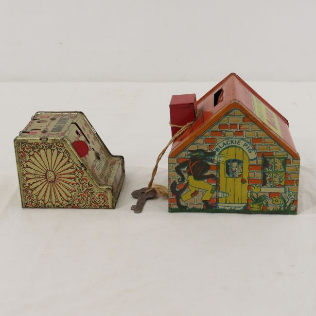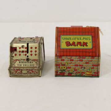 4 Vintage Tin Litho J. Chein Banks, Book & more - Book: J. Chein & Co. Collector's Guide, Cash registers, Monkey, Lot size: 10 x 8 x 6",4 lbsPhotos are part of description. Please ask questions and read terms & conditions before bidding.