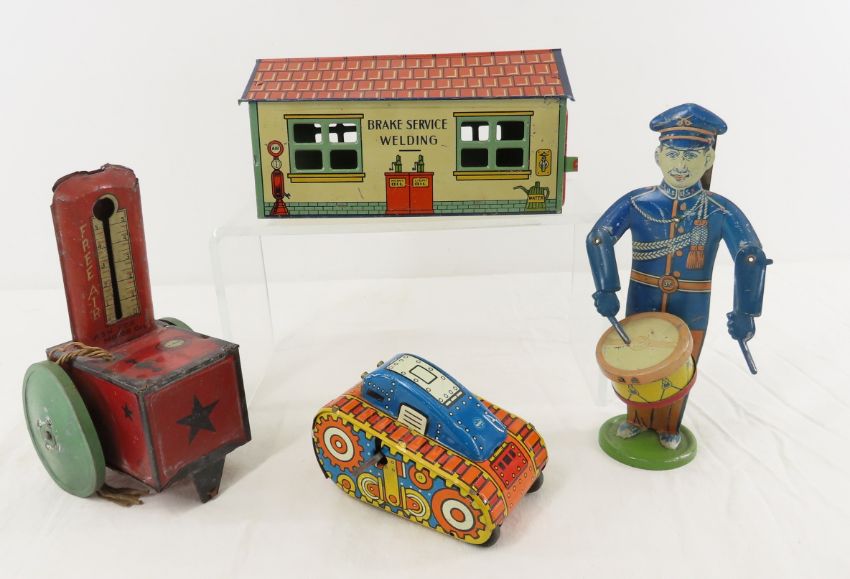 Vintage J. Chein & Marx Tin Litho Toys - Brake Service & Welding Shop, Drumming Man, Tank. Largest piece 7", Lot size: 10 x 9 x 6", 2 lbsPhotos are part of description. Please ask questions and read terms & conditions before bidding.