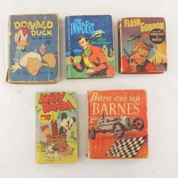 24 Big Little, Better Little & Character Books - Better Little Books: 2 Donald Duck, Pinocchio, Mickey Mouse, Andy Panda, Bugs Bunny, Gene Autry, Buck Rogers, Captain Midnight, Flame Boy. Big Little Books: Popeye, Donald Duck, the Invaders, Reg'larFellas, Snow White, Mickey Mouse. Fast Action Stories Disney: Pinocchio, Donald Duck, Tailspin Tommy. Others include: Hopalong Cassidy, "Elmer and his dog spot", "Burn 'em up Barnes", "Little Mary Mixup" - missingback cover. Most have rough covers. Lot Size: 11 x 11 x 9", 6.5 lbsPhotos are part of description. Please ask questions and read terms & conditions before bidding.