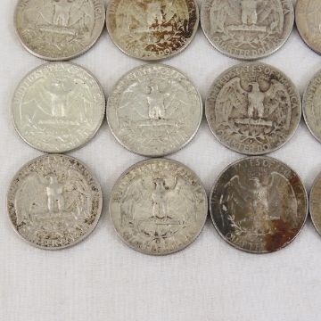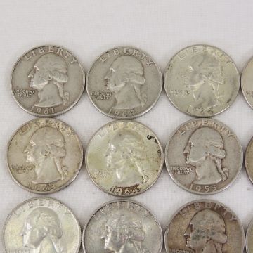 $5 Face Washington Silver Quarters 1950s-1960s - Lot Size 3x3x3" 2lb Photos are part of description, Live Auctioneers only displays the 1st 20 photos per lot. Please ask questions and read terms & conditions before bidding.