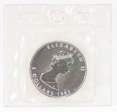 1989 $5 Canadian Silver Maple Leaf .9999 Silver - Sealed in RCM plastic. Lot Size 2x2x1" 1lb Photos are part of description, Live Auctioneers only displays the 1st 20 photos per lot. Please ask questions and read terms & conditions before bidding.