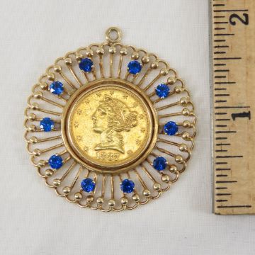 1887 $5 Gold Liberty in 14k gold pendant - With Spinel Stones, Total weight of the piece is 18.8g. Lot Size 3x2x1" 1 lb Photos are part of description, Live Auctioneers only displays the 1st 20 photos per lot. Please ask questions and read terms & conditions before bidding.