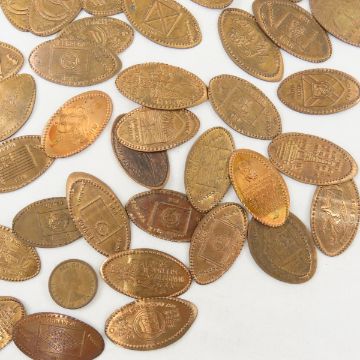 Collection of Souvenir Squished Pennies & 2 Dimes - Lot Size 7x4x4" 5lb Photos are part of description, Live Auctioneers only displays the 1st 20 photos per lot. Please ask questions and read terms & conditions before bidding.