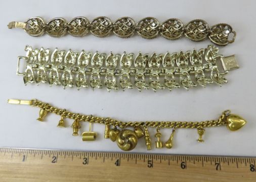 Vintage Signed Enco Charm Bracelet & Coro Jewelry - 10 brooches, AB bracelet has all stones, other bracelet is missing a few, black cameo necklace, clip earrings, enamel heart necklace, 2 silver tone necklaces, 2 strand gold bead necklace is missing 1 strand and some beads are damaged. lot size: 8 x 5 x 5", 1.8 lbs