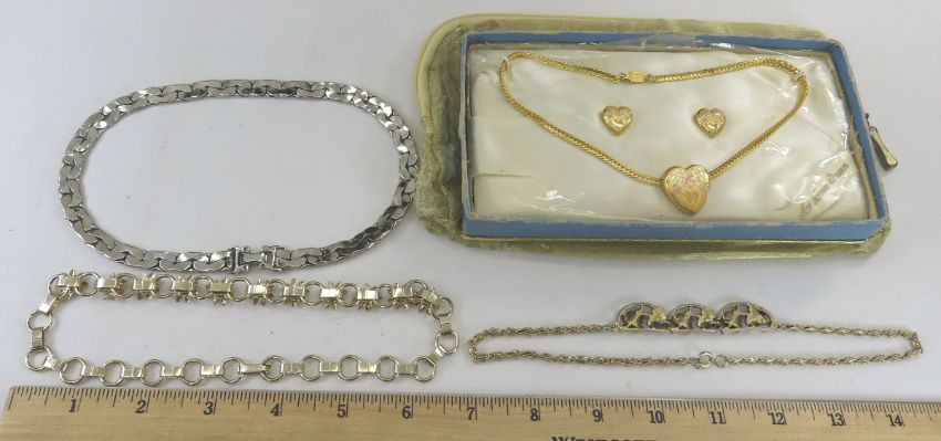 Vintage Jewelry- Necklaces, Clip Earrings & More - bracelet/earring set with original Dayton's price tags, green necklace/earring set, blue & copper bracelet/earring set, gold filled heart necklace/earring set in box with pouch, and more. Lot size: 12 x 10 x 6" , 2 lbs Photos are part of description, Live Auctioneers only displays the 1st 20 photos per lot. Please ask questions and read terms & conditions before bidding.