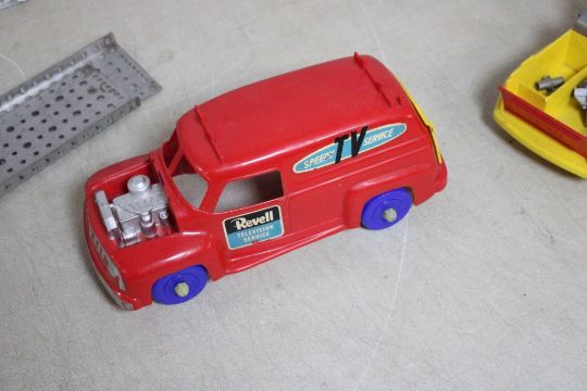 Vintage Toy Lot - Including Motorized Erector, Revell TV Truck & Revell Plumbing Service. 9 Lbs. Lot Size 14" x 18" x 7". Photos are part of description (Live Auctioneers only shows up to 20). Please ask questions and read terms & conditions before bidding.