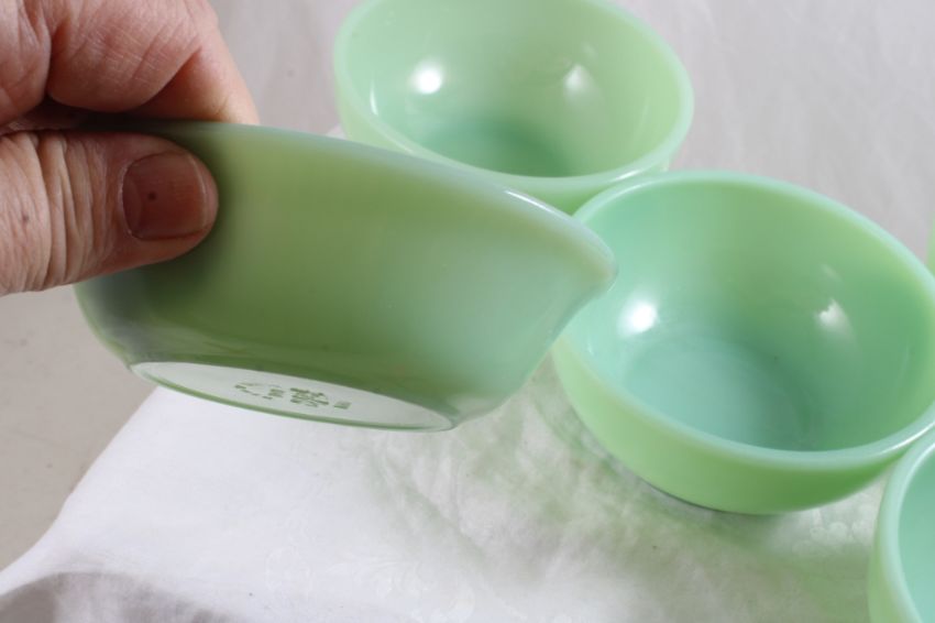 4 Fire King Jadeite 5" Bowls, 1 Berry Bowl - 4 5" Diameter Jadeite Bowls & 1 Fire King Jadeite Jane Ray Berry Bowl. 3 of the 5" Bowls have some chips on bottom rim as pictured. 3 Lbs. Lot Size 5" x 6" x 5". Photos are part of description (Live Auctioneers only shows up to 20). Please ask questions and read terms & conditions before bidding.