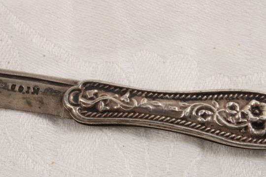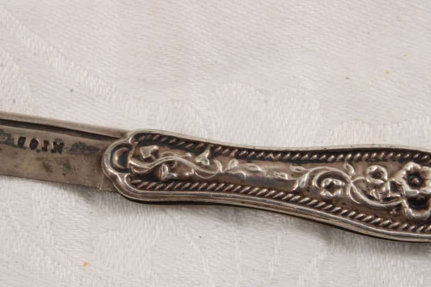 Antique Coin Silver Gentleman's Pocket Knife - Engraved M.J. 6 Oz. Lot Size 3". Photos are part of description (Live Auctioneers only shows up to 20). Please ask questions and read terms & conditions before bidding.