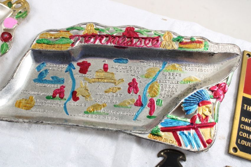 3 Ashtrays, Letter Opener, Crumb Scraper - 3 Metal State Ashtrays Alabama, Georgia, Tennessee, Rockefeller Letter Opener Souvenir, Mini Japan Crumb Scraper, 3 Metal Gosiger Machinery Emblems Ohio and Kentucky. 2 Lbs. Lot Size 7" x 7" x 7". Photos are part of description (Live Auctioneers only shows up to 20). Please ask questions and read terms & conditions before bidding.
