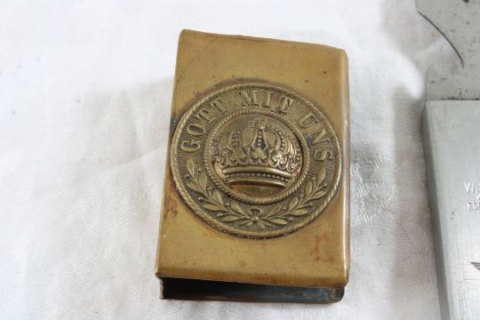 WWI German Trench Art Match Safe, Mess Utensils - German Soldier Mess Utensils with Insignia in German God With Us. 8 Oz. Lot Size 7" x 3" x 3". Photos are part of description (Live Auctioneers only shows up to 20). Please ask questions and read terms & conditions before bidding.